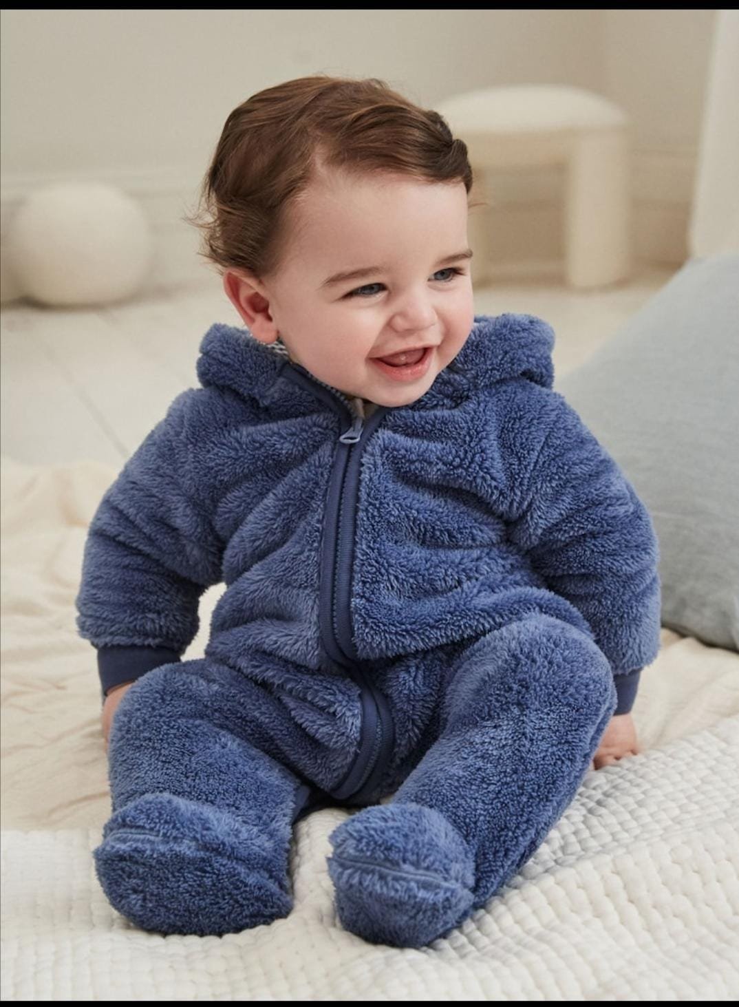 Soft and cozy baby fleece onesie designed for winter wear. Made from warm, skin-friendly fabric with a front zipper and hood for easy wear and extra comfort. Suitable for both baby boys and girls.