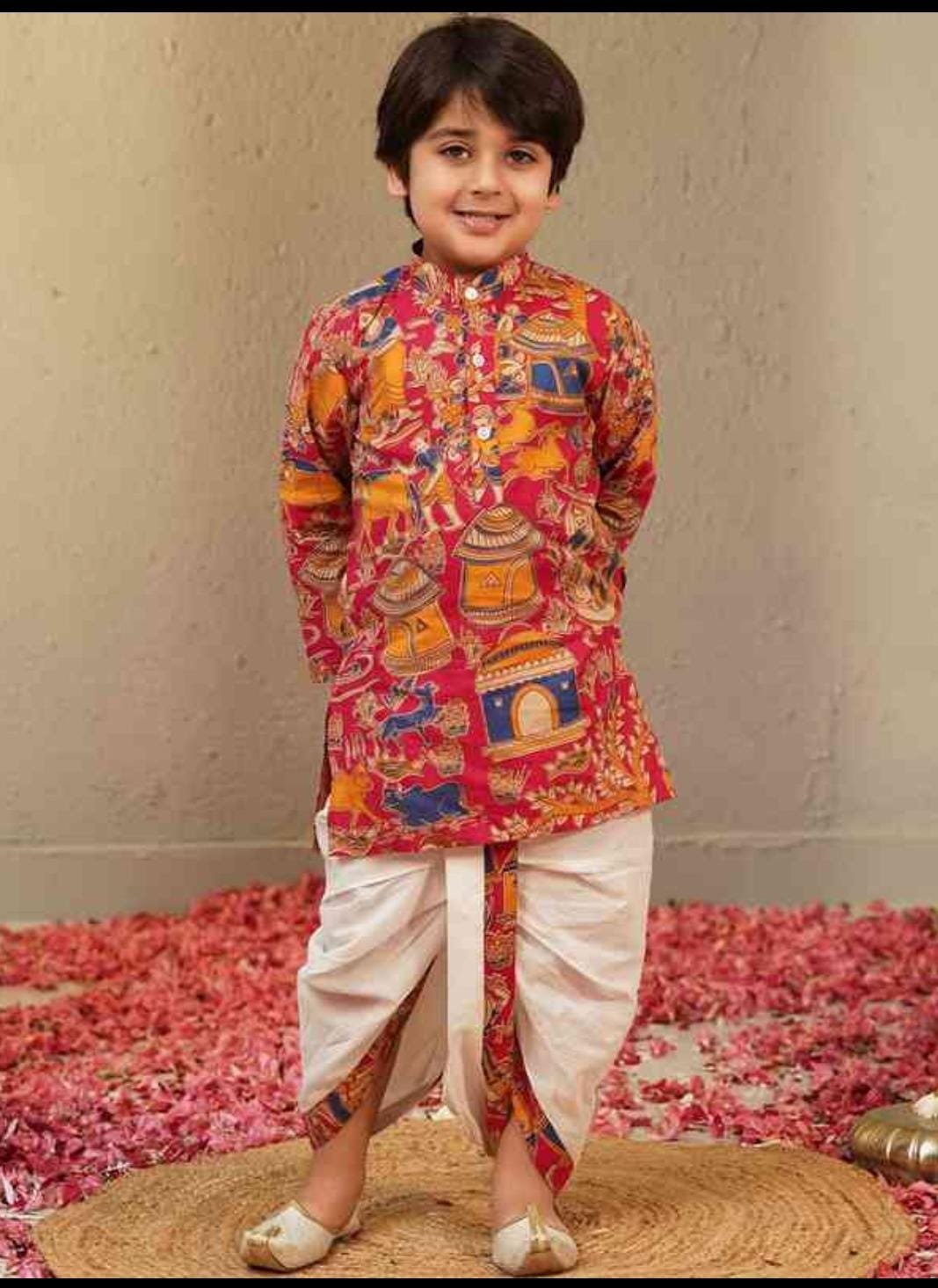 Stylish kids ethnic kurta dhoti set made from soft cotton fabric with vibrant traditional prints, perfect for festive and special occasions.