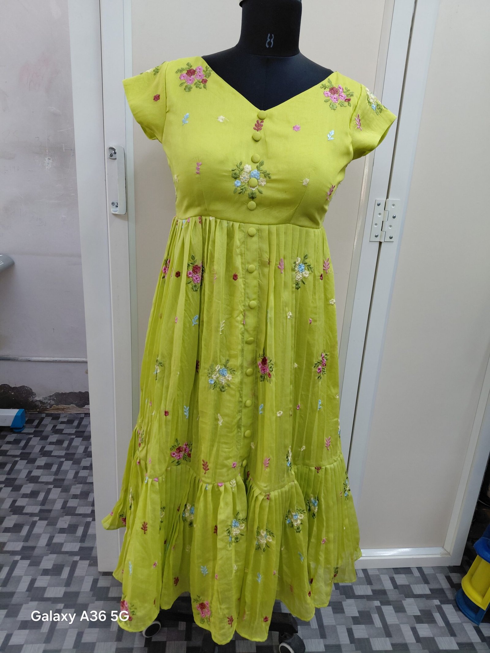 Mul chanderi layered frock with self buttons on middle part. Maxi length, customizations available.